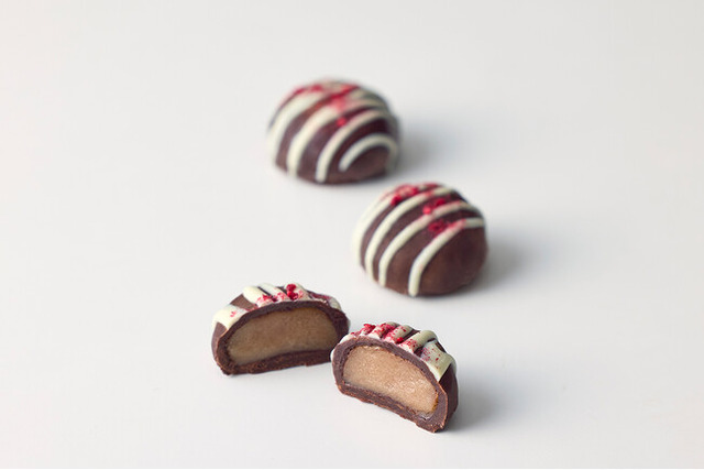 むにゅっとしょこらは、従来の生八ッ橋で餡を包むカタチから、発想の転換をし、チョコレートをたっぷり練り込んだチョコ餡でもちもちした生八ッ橋の生地を一つ一つ優しく包み込むことで、新食感のチョコレート菓子に仕上げました。コーヒーや紅茶とともに、ぜひお楽しみください。