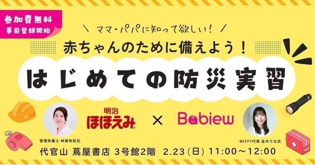 いま最も参考にされているベビーグッズの口コミサイト「Babiew(べビュー)」を運営するBEFFY株式会社(本社:東京都渋谷区、代表取締役CEO金木りな)は、赤ちゃん用ミルク「明治ほほえみ」を展開する株式会社 明治(本社:東京都中央区、代表取締役社長:松田 克也)との特別コラボイベント「赤ちゃんのために備えよう!はじめての防災実習 by 明治ほほえみ× Babiew ベビュー」を2025年2月23日(日)、代官山 蔦屋書店にて開催いたします。