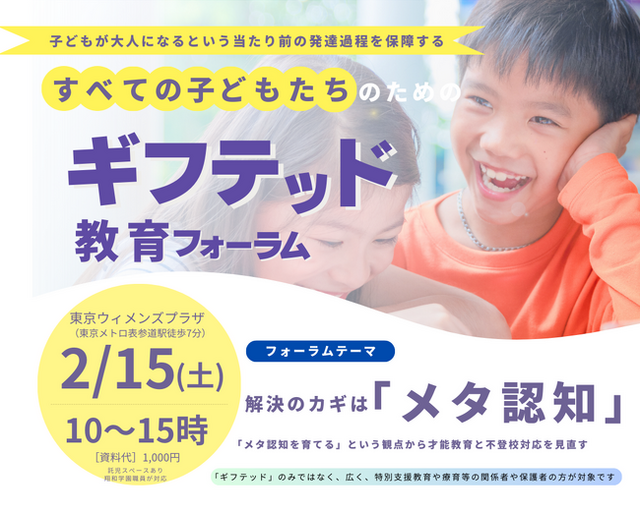 今回のフォーラムは、「ギフテッド」のみではなく、広く、特別支援教育や療育等の関係者や保護者の方が対象です。