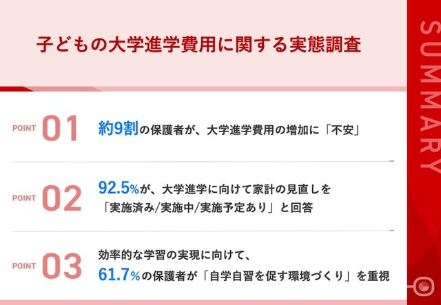 - 01|約9割の保護者が、大学進学費用の増加に「不安」
