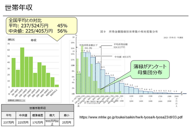 子育て世帯でありながら、世帯年収は全国平均との比較を行うと全国(中央値)が405万円のところ、アンケート(中央値)225万円であった。全国平均に単身世帯も含むことから、大変厳しい状況が見て取れた。