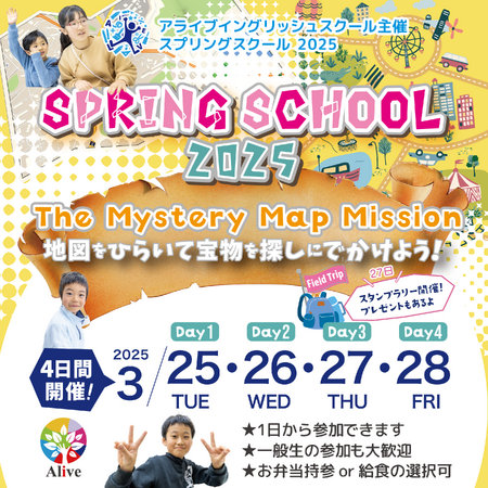 株式会社アライブ(本社:名古屋市、代表取締役:三井博美)は、未就園児、園児、小学生を対象に、2025年3月25日から4日間、英語を使って地図を読みながら宝探しを楽しむ体験型イベント「地図をひらいて宝物を探しにでかけよう!The Mystery Map Mission」を開催します。