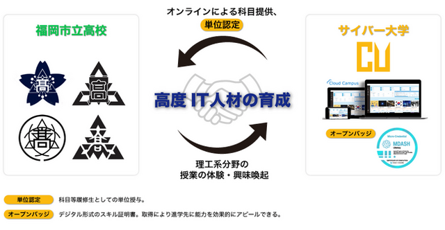 サイバー大学(学長:川原 洋、所在地:福岡市東区、以下「本学」)は、2025年2月12日に、福岡市立福翔高等学校、博多工業高等学校、福岡女子高等学校、福岡西陵高等学校と高大連携の包括協定を締結しました。本協定に基づき、2025年度春学期より、本学の正規オンライン授業科目を4校の生徒に無償で提供開始します。