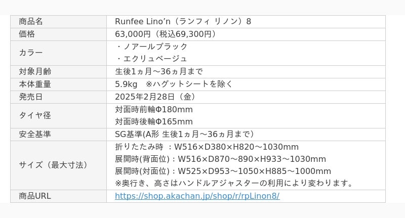 株式会社赤ちゃん本舗(本社:大阪市中央区 https://www.akachan.jp)は、ピジョン株式会社(本社:東京都中央区)の押しやすく乗せやすいA形ベビーカー「Runfee Lino’n(ランフィ リノン)」シリーズから、『Runfee Lino’n 8』(※1)を2025年2月28日(金)より全国のアカチャンホンポとオンラインショップ(https://shop.akachan.jp)にて販売いたします。