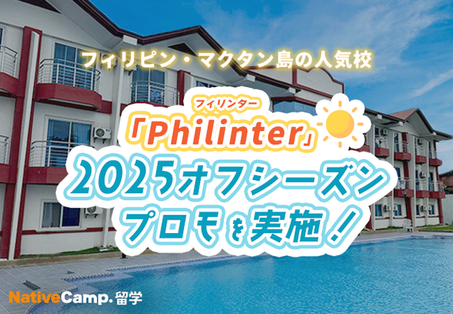 このたび、ネイティブキャンプ留学は、フィリピン・マクタン島の人気校「Philinter」において、2025オフシーズンプロモを実施いたします。この機会にぜひ、フィリピンで人気のある語学学校の1つ「Philinter」で海外生活をご体験ください。