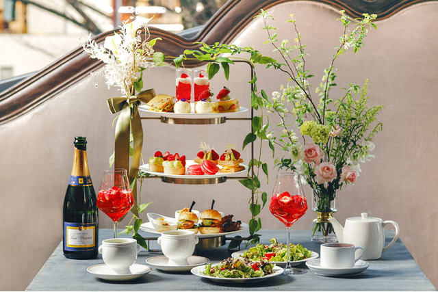 お飲み物はシンガポール創業のラグジュアリーティーブランド TWG Teaの紅茶など全16種類を好きなだけお召し上がりいただけます。また、お酒とともにお楽しみいただけるよう、フレッシュのいちごにローズシロップと花びらを入れ、シャンパンを注いだエレガントなカクテルもオプションで登場します。