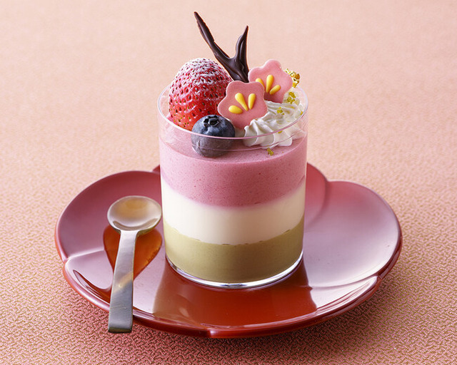 期間限定スイーツの「ひなまつり」は、ラズベリーといちごのムース・ホワイトチョコレートムース・ピスタチオのムースを重ね、菱餅をイメージさせる色で仕上げました。層の間には求肥やスポンジケーキをはさみ、食感のアクセントも楽しめるケーキです。