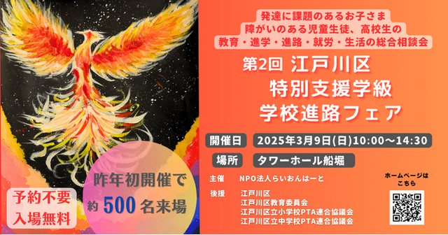 365日体験型子ども食堂を運営するNPO法人らいおんはーと(事務局:東京都江戸川区、理事長:及川 信之)は「第2回江戸川区特別支援学級・学校進路フェア」を2025年3月9日(日)タワーホール船堀にて開催いたします。特別支援学級・学校の生徒が義務教育を終了した後の進路には多くの可能性がありますが、当事者や保護者に情報が届きにくい状況です。