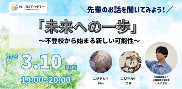 株式会社NIJIN(本社:東京都江東区、代表取締役:星野達郎)が運営する不登校オルタナティブスクール「NIJINアカデミー」は、自校に通う中学3年生の2人と大阪教育大学院に通う不登校経験者しんのすけさんとの対談を開催します。