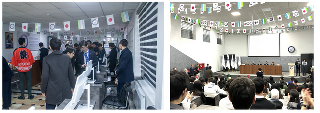 当日は在ウズベキスタン日本大使である羽鳥隆様にもお越しいただきました。来場者数は456名にのぼり、JDUの講堂では現地学生の前で、JV-Campusの紹介を行いました。そのほか、日本への留学のきっかけとなるよう、日本から筑波大学、名古屋大学、関西大学の講師の方々にお越しいただき、各大学の説明や模擬授業を行っていただきました。また、JDUの体育館では日本体験イベントとして、書道体験や、わなげ、ヨーヨー釣りなどを現地学生が楽しみました。