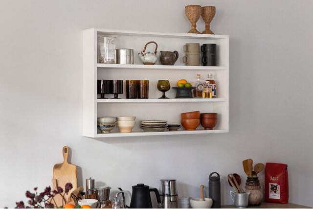 「レギュラーシェルフ」は、キッチンやダイニング、リビングに設置しやすい壁付け収納棚です。奥行き14.5cmの浅さは、コーヒーの道具やカップ、調味料、小皿などがぴったりフィット。日常使いのアイテムを横一列に並べることで、見た目にも美しく、使いやすさも考慮した収納です。