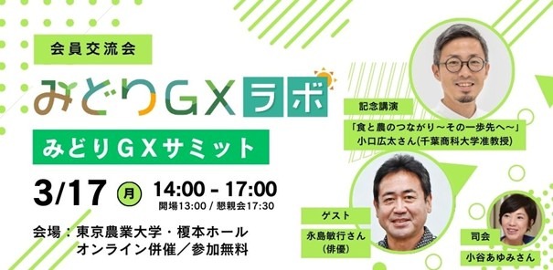 会場とオンラインでの参加者を募集しています。参加無料で、誰でも申し込めます。有機農業に詳しい千葉商科大学の小口広太准教授が「食と農のつながり~その一歩先へ~」と題して記念講演。多様な主体が参画するみどりGXラボのパートナー会員が、持続可能な食と農の未来を語るパネルディスカッションも行います。ゲストは、俳優でみどりGXラボ応援団の永島敏行さん。サミット閉会後には、懇親会を開きます。