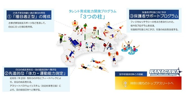 県では、競技スポーツのすそ野拡大や、将来の神奈川育ちのアスリートの早期からの発掘・育成及び計画的な競技力向上を図ることを目的として、ゴールデンエイジといわれる児童を対象としたタレント発掘・育成事業「かながわジュニアチャレンジプロジェクト」を実施しています。