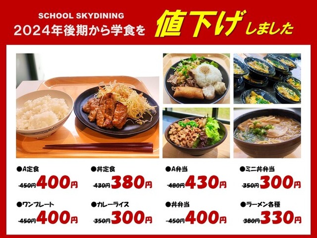 しかしながら、昨今の世界的な物価高騰を受けて「食」の面でさらなる支援の必要性が生じていると判断し、令和6年9月19日(木)より、学生食堂(SKY DINING)の一部メニューの価格を50円値下げして販売しています。今回の値下げ以前より、学食運営委託会社(株式会社コトブキスマイル:代表取締役 小柏 剛)は物価の高騰にもかかわらず、販売価格の据え置きや値上げの抑制に尽力いただいてきましたが、さらなる学生の経済的負担を軽減するため、後援会の助成(後援会の予算から補填)により、今回の値下げが実現いたしました。
