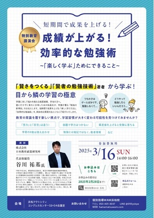 個別指導塾「個別指導WAM浜松校」(静岡県浜松市)は、2025年3月16日(日)に浜松アクトシティにて、特別教育講演会『成績が上がる!効率的な勉強術~「楽しく学ぶ」ためにできること~』を開催いたします。本講演では、塾に通わず独学で東京大学に現役合格を果たし、現在は教育コンサルタントとして活躍する谷川祐基氏を特別講師に迎え、学習の質を向上させる方法や、学ぶことを楽しくするための秘訣について解説します。