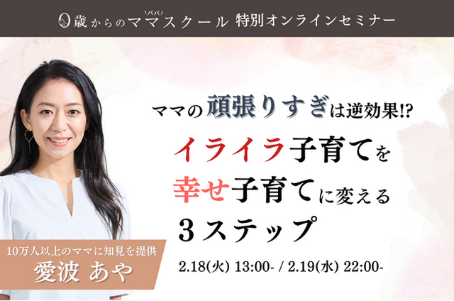 「0歳からのママスクール(R)」(代表:小沼もか)は2025年2月18日(火)13時、2月19日(水)22時に0~3歳の親向けに「イライラ子育てを幸せ子育てに変える3ステップ」を解説する無料オンラインセミナーを開催します。0歳からのママスクール(R) 「ママの心」講座監修・講師を務めるSleeping Smart Japan株式会社代表・愛波あやが、幼少期の育児で母親が陥りやすい寝不足・完璧主義・虚無感への対処法を解説いたします。