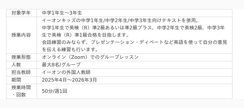 2024年9月から開講している「オンライン英会話講座(グループレッスン)」では、英会話力だけでなく、「コミュニケーション力/思考力/判断力/表現力/問題解決力/知識力/チームワーク力」の「時代を生き抜く力」を養う、イーオンの子ども向け英会話「イーオンキッズ」の中学生向けレッスンを、イーオンの外国人教師が50分/回、全22回実施しています。本講座がご受講者様からご好評をいただいたことで、2025年4月からは中学3年生を対象とした講座を追加いたします。