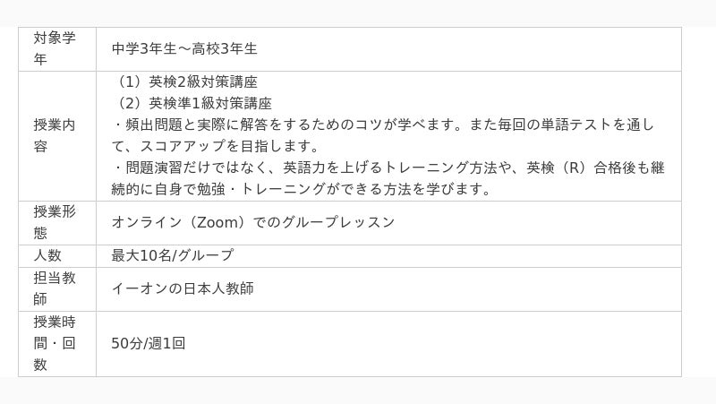 また現在では大学が指定する英検(R)を取得していることで受験での加点や、英語試験の免除となる大学も多くあります。イーオンでは日頃から英会話の習得のみならず資格取得にも力を入れております。これまでにご提供してきた英検(R)対策レッスンのノウハウを活かして、今回新たに中学3年生から高校3年生までを対象とした「英検(R)対策講座」も開講することとなりました。