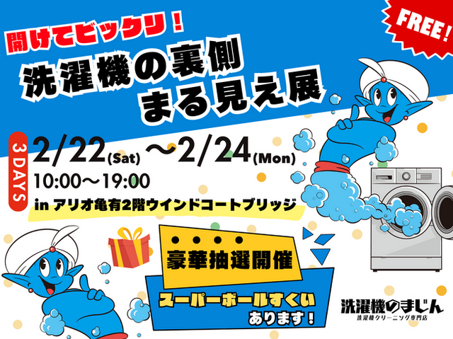 洗濯機クリーニング事業を展開する東海エネテック株式会社(本社:東京都千代田区、以下「当社」)は、2月22日(土)~2月24日(月)の3日間、アリオ亀有2階ウインドコートブリッジにて「開けてビックリ!洗濯機の裏側まる見え展」を開催いたします。本イベントは、当社初の試みであり、洗濯機内部の構造や汚れの実態を直接ご覧いただき、クリーニングの重要性について知っていただく機会となります。また、来場者様に楽しんでいただけるよう、豪華賞品が当たる抽選会やスーパーボールすくいなどの催しもご用意しております。