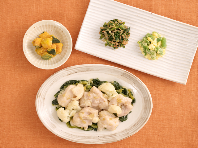 副菜は、アーモンド入りで香ばしく仕上げたかぼちゃのごまあえ、甘辛い味わいと春菊の香りがベストマッチの春菊のそぼろあえ、ふわふわの卵とシャキシャキのインゲンの食感が楽しいインゲン卵サラダです。