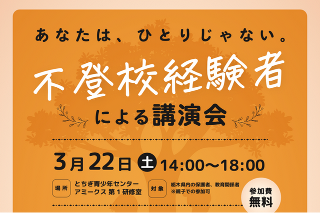 NPO法人キーデザインは、2025年3月22日(土)に「あなたはひとりじゃない 不登校経験者による講演会」を開催します。場所は栃木県宇都宮市にある「栃木青少年センター アミークス」。対象は子どもが不登校の保護者です。