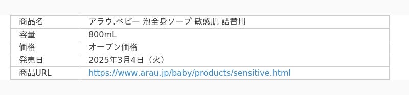 その中でも敏感肌タイプは、特に低刺激な脂肪酸を厳選し、サラヤ独自の“肌すこやか成分”をシリーズ最大濃度配合しました。ベビー専門店やドラッグストアを中心に、2022年の発売から多くの子育て層に支持されています。そのような背景から、今回詰替や買い替えの手間を軽減できる大容量の「アラウ.ベビー 泡全身ソープ敏感肌 詰替用800mL」を新発売いたします。