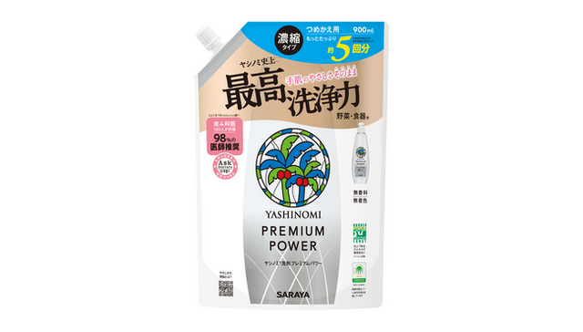 今回発売する「ヤシノミ洗剤プレミアムパワー 詰替用900mL」は、買い替えの手間が軽減できる大容量の詰替用です。