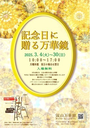 3月は旅立ち、また人生の節目を迎える季節。「記念日に贈る万華鏡」(主催:株式会社流山ツーリズムデザイン)をテーマに国登録有形文化財 流山万華鏡ギャラリー&ミュージアムにて展示いたします。開催日は、2025年3月4日(火)~ 30日(日) 10時~17時 (※月曜休館)まで。