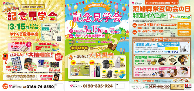 株式会社あいプラン(北海道札幌市)では、3月15日の「冠婚葬祭互助会の日」を記念して札幌市、旭川市の斎場で記念見学会を開催します。各会場では斎場施設をご覧いただけるほかマルシェやアウトレットセールなども開催。互助会を身近に感じていただけるイベントです。