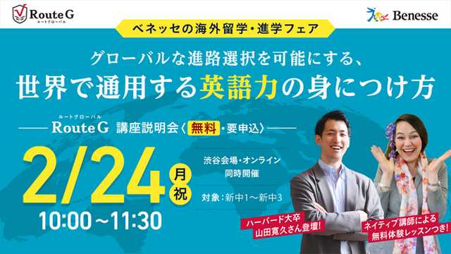 株式会社ベネッセコーポレーション(本社:岡山県岡山市、代表取締役社長:岩瀬大輔 以下:ベネッセ)の中高生向け英語専門塾「Route G(ルートグローバル)」は、2025年2月24日(月・祝)、海外大進学や留学を考える中学生と保護者向けセミナーを、渋谷会場およびオンライン(Zoom)の同時開催で開催します。