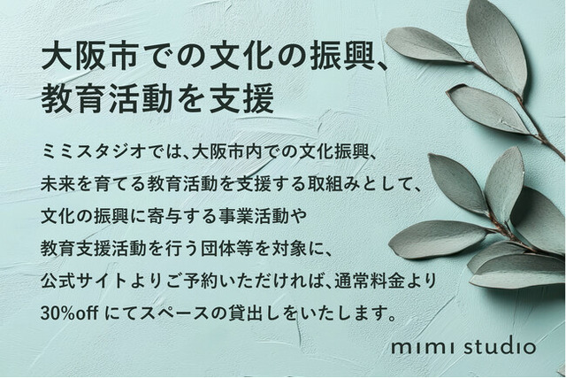 このたび、ミミスタジオでは、大阪市内での文化振興や、未来を育てる教育を支援する取組みとして、文化の振興に寄与する事業活動や教育活動を行う団体等を対象に、公式サイトよりご予約いただいた方限定で、通常料金より30%OFFにてスペースの貸出しをいたします。