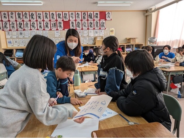 1月16日に実施されたキャリア教育授業では、仕事の多様性について学び、その後、ノベルティ制作体験のワークショップを行いました。小学生たちは、マグカップ、2WAYバッグ、ポーチの中から選び、相応しいイラストと想いを伝えるメッセージを考えながら、オリジナルのデザインを完成させました。チームで話し合いながら「家族にあげたい!」「先生にありがとうって伝えたい!」「トートバッグの方が使ってもらえるよ」と、熱心に意見交換する姿が見られました。