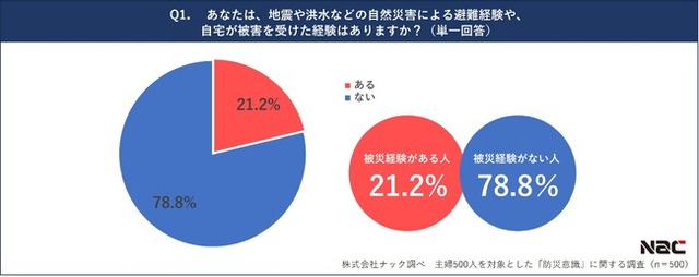 被災経験の有無による回答の違いを調査するため、被災経験(地震や洪水などの自然災害によって避難した経験、もしくは自宅が被害を受けた経験)があるかを聞いたところ、回答者500人のうち21.2%の106人が「被災経験あり」、78.8%の394人が「被災経験なし」という結果になりました。