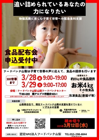 認定NPO法人フードバンク山梨(所在地:山梨県南アルプス市 理事長:米山けい子)は、来る2025年3月28日(金)・29(土)に子育て世帯へ食品を配布します。