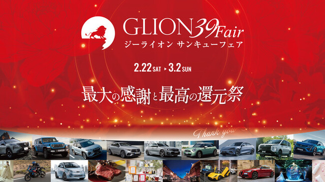 GLION GROUP(ジーライオングループ 所在地:兵庫県神戸市)は、2025年2月22日(土)から3月2日(日)までの9日間、日頃からご愛顧いただいているお客様に最大の感謝をお届けする還元祭「GLION 39 Fair」を開催いたします。車のプロがオススメする人気のイチオシ車両や期間中にご成約いただいた方限定のダブルチャンス企画を実施。ぜひこの機会にジーライオングループ各店舗へお越しください。