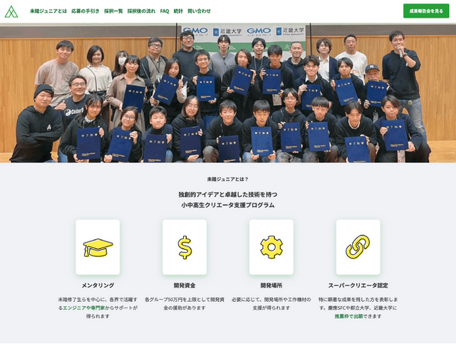 プログラミング教育の普及を背景に、IT技術への高い関心と技能を持つ若い人々が増えており、そういったクリエータをさまざまな角度から支援し、広く活躍できる場を提供する価値が高まっています。実際、25歳未満を対象とした経済産業省所管の独立行政法人情報処理推進機構(IPA)の人材育成プログラム『未踏IT人材発掘・育成事業』では、起業家・研究者などの突出したIT人材を数多く輩出しています。一方で、大学や研究室などの環境を活かしてプロジェクト提案書を洗練できる大学生・大学院生に比べ、そうした場を身近に持ちづらい小中高生は、応募件数・採択件数ともに少ないことが課題でした。