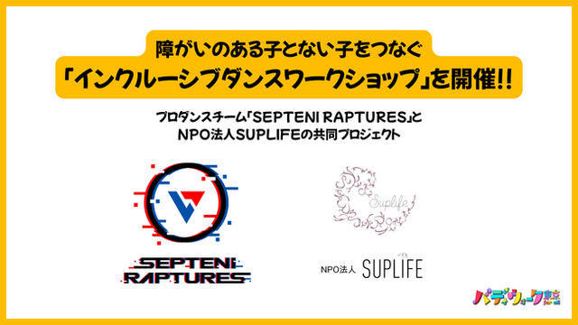 株式会社セプテーニ・ホールディングス(本社:東京都新宿区 代表取締役:神埜 雄一、証券コード:4293)の連結子会社であるPERF株式会社(本社:東京都新宿区、代表取締役:柳 裕貴、以下「PERF」)が運営するプロダンスチームで、日本発のプロダンスリーグ「第一生命D.LEAGUE」に参画中の「SEPTENI RAPTURES(セプテーニ ラプチャーズ、以下「ラプチャーズ」)」は、NPO法人SUPLIFE(以下「SUPLIFE」)と共同で、障がいのある子とない子をつなぐ、インクルーシブダンスワークショップを開催いたします。多様な背景を持つ子どもたちが一緒になって、ダンスを楽しみながら学びあうことで、お互いを尊重し支え合うことのすばらしさを体感することを目指して展開いたします。