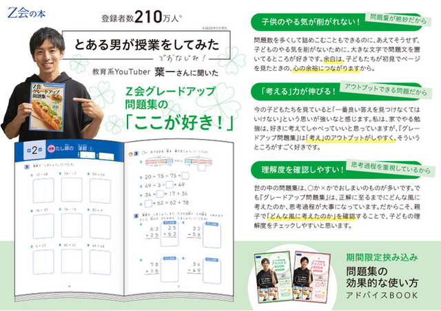Z会の小学生向け問題集「グレードアップ問題集」シリーズを対象書店にてご購入いただくと、葉一氏による「おうち学習応援アドバイスBOOK」がもらえます!