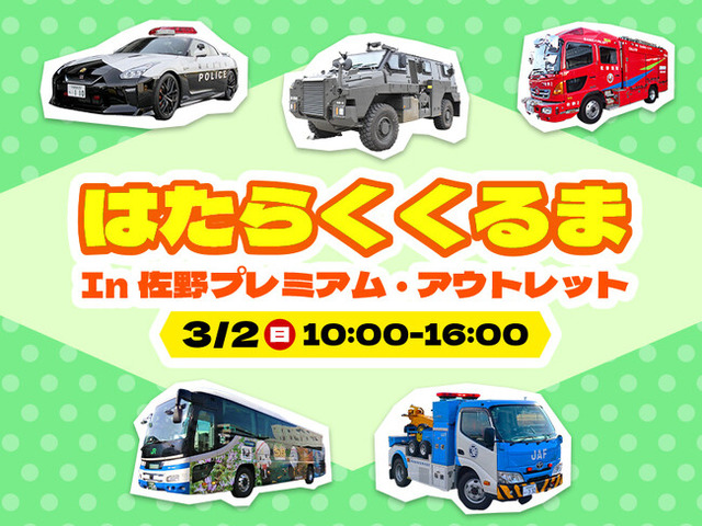 佐野プレミアム・アウトレット(所在地:栃木県佐野市 運営:三菱地所・サイモン株式会社)では、警察や消防、自衛隊など地域の5団体と連携し、栃木県の地域の安全や交通アクセスを守り、さまざまな場面で活躍する車が集合するイベント「はたらくくるま in 佐野プレミアム・アウトレット」を2025年3月2日(日)に開催します。