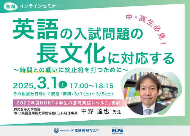 今回開催するセミナーでは、NPO英語運用能力評価協会(ELPA)のご協力のもと、同協会理事長でもある駒沢女子大学の中野達也先生より、近年の英語の入試問題に対応していくためにどのような勉強をしていけばよいのか、中学生・高校生が心がけておきたい勉強のコツやアドバイスなどをご講演いただきます。