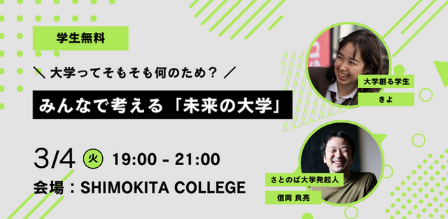 地域を旅する大学 さとのば大学(運営:株式会社アスノオト 代表取締役:信岡良亮、所在地:東京都千代田区、以下当社)は、日本初のレジデンシャル・カレッジ「SHIMOKITA COLLEGE」を舞台に、現役大学生でありながら新たな大学を創りを通して社会変革を目指すイチカワドイル フランスィス聖氏と、さとのば大学発起人である信岡良亮とのトークイベントを開催いたします。皆さんと共に、未来の大学や教育の形について考えます。