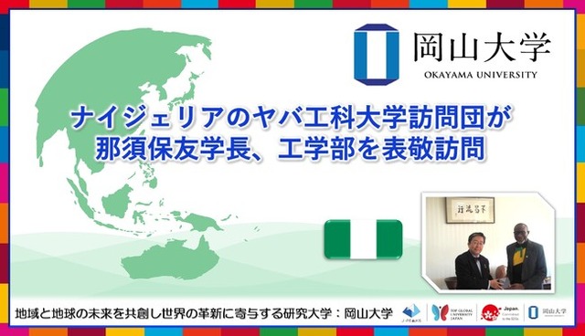 国立大学法人岡山大学(本部:岡山市北区、学長:那須保友)は、2025年2月10日、ナイジェリアのヤバ工科大学(Yaba Collage of Technology: YABATECH)から、Funso Isolaowa評議会議長、Abdul Ibraheem Adedotun学長らが本学を訪れ、那須保友学長を表敬訪問しました。本学からは那須学長のほか、鈴木孝義副学長(国際・同窓会担当)、田村国際企画課長が出席しました。Abdul学長は、2008年から2011の間、本学大学院自然科学研究科の博士後期課程に在籍し、現在は岡山大学国際同窓会(OUIAA)の会員であることから、本学を訪問しました。