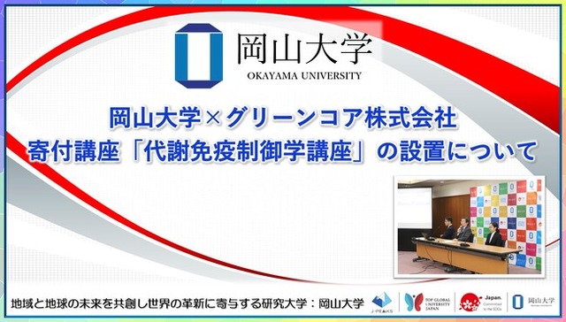 国立大学法人岡山大学(本部:岡山市北区、学長:那須保友)は、グリーンコア株式会社のご寄付を受けて、寄付講座「代謝免疫制御学講座」を設置しました(2025年1月~)。