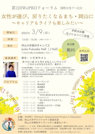 この一環として、地域や企業とともにこれらの取り組みを発展させていくため、多様な分野の有志により“女性が輝くまち・岡山”を目指して設立された団体 WePRO(ウィープロ)との共催でフォーラムを開催します。若者・女性の流出が続く岡山において、課題解決の契機として年齢・性別を問わず多くの方々にご参加いただければと思います。よろしくお願いします。
