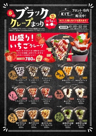 もちもちとした食感の黒いクレープ生地に、全国各地の旬のいちごを贅沢にトッピング。いちごの甘酸っぱさと、カスタードクリームとミルクホイップの2種類の優しい甘さが絶妙にマッチした、春を感じる一品です。