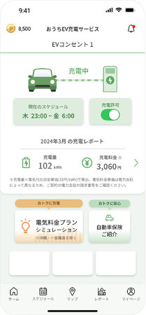 今回提供する「おうちEV充電サービス」は利用者に最適な電気料金プランをアプリ上で提案し電気代節約(※2)をサポートします。電力会社と提携しEVユーザー専用の電気料金プランやポイント還元プラン等のオリジナルプランを用意しました。さらにIoT EVコンセント(※5)と通信し充電量や電気代を見える化。電気料金の安い時間帯での充電制御を可能にし、より一層の電気代を節約します(※2)。