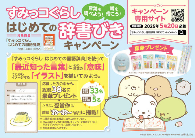 『すみっこぐらし はじめての国語辞典』新発売を記念して、 “言葉を調べるたのしみ”をお子様自身が体験できる「すみっコぐらしはじめての辞書びきキャンペーン」を開催いたします。専用の応募用紙を使って、「最近知った言葉と意味」、そこからイメージする「イラスト」を描いて応募してください。応募された方のなかから、総勢38名(〈すみ〉33名+〈っコ〉5名)に、学年別最優秀賞、学年別優秀賞として、豪華すみっコぐらしグッズをプレゼント! さらにイラストは雑誌『ね~ね~』に掲載させていただきます!