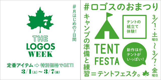 さまざまなアイテムをお得に購入できる「THE LOGOS WEEK」と、たくさんのテントを見て、触って、組立て体験できる「テントフェスタ」に、キャンプデビューをお考えの方はもちろん、アウトドア経験者の皆様もぜひお越しください。