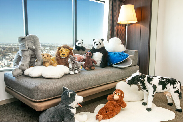 当プランは、生徒たちの「景色の良いお部屋に泊まりたい」「ふわふわのぬいぐるみと過ごしたい」「家族で楽しみたい」「パパママにリラックスしてほしい」などのアイデアを反映。お部屋は38~39Fのホテル内で最も景色の良いお部屋をご用意。ふわふわで愛らしいたくさんの動物のぬいぐるみたちがお出迎えいたします。パパやママにリラックスしてもらうために、シャンパンハーフボトルもお楽しみいただけます。