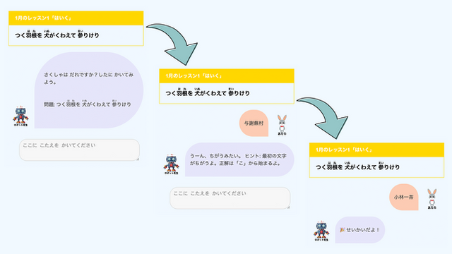 AIチャット型「応用レッスン」では、かけ流しやオンラインレッスンでインプットした内容(ことわざ、俳句、四字熟語、慣用句、百人一首)について、AIとのチャット形式で質問に答える問題を中心に構成されている。その他にも、心内表象化のスキルを身につけるための、お話の内容を問う問題、なぞなぞや「何の音?」といった音のクイズなど、子どもたちの興味・関心を惹き、楽しみながら学習できるレッスンを用意している。